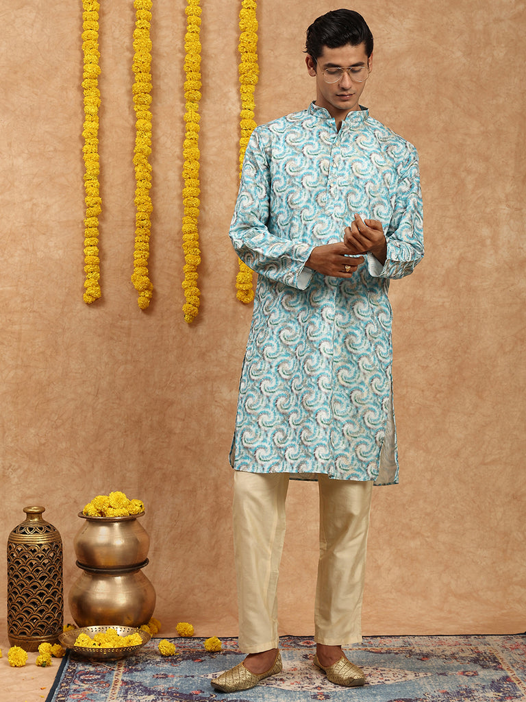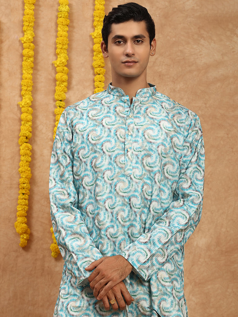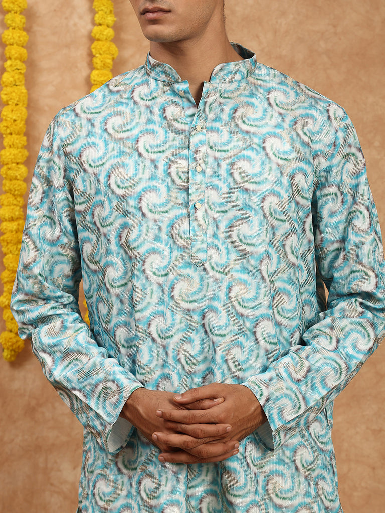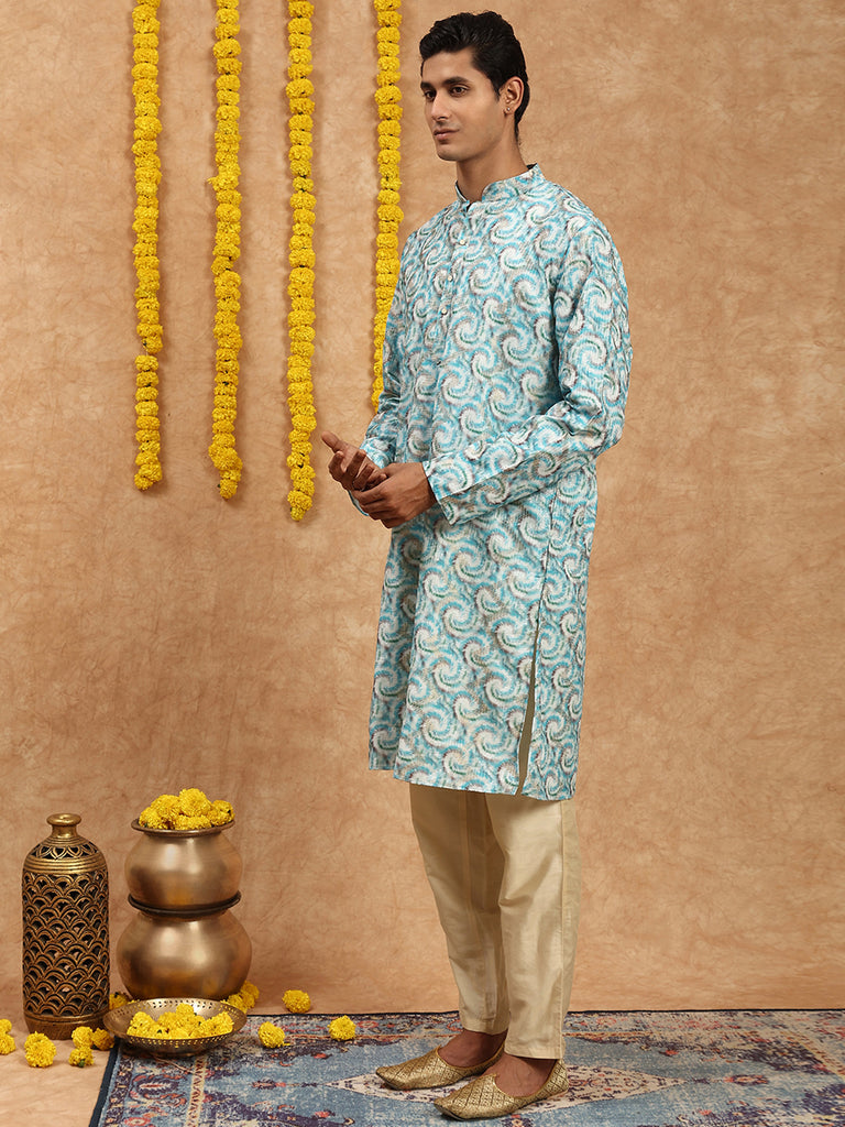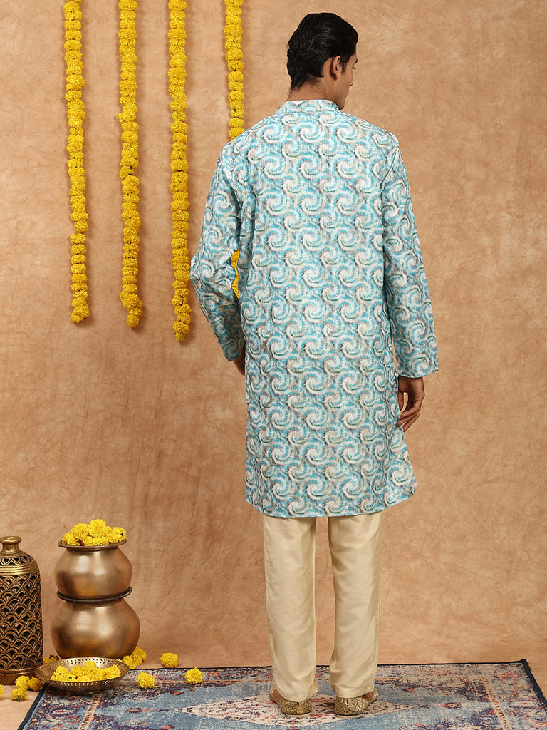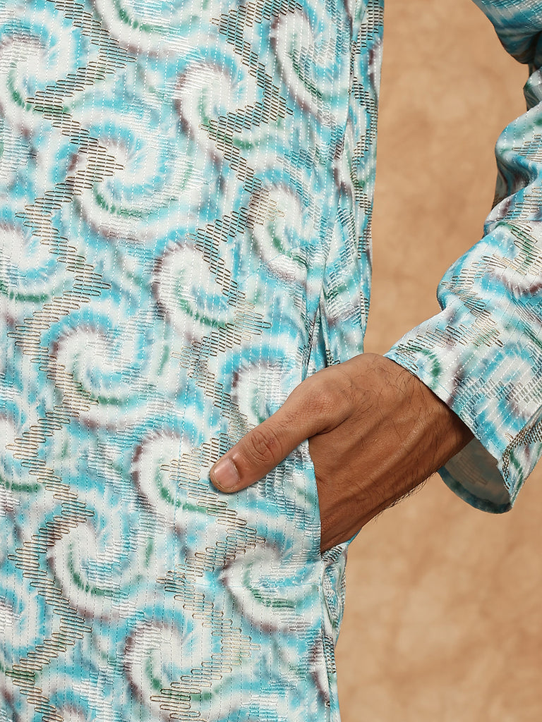 Sanwara Men's Sky Blue Designer Zari Work Stylish Printed Kurta Set