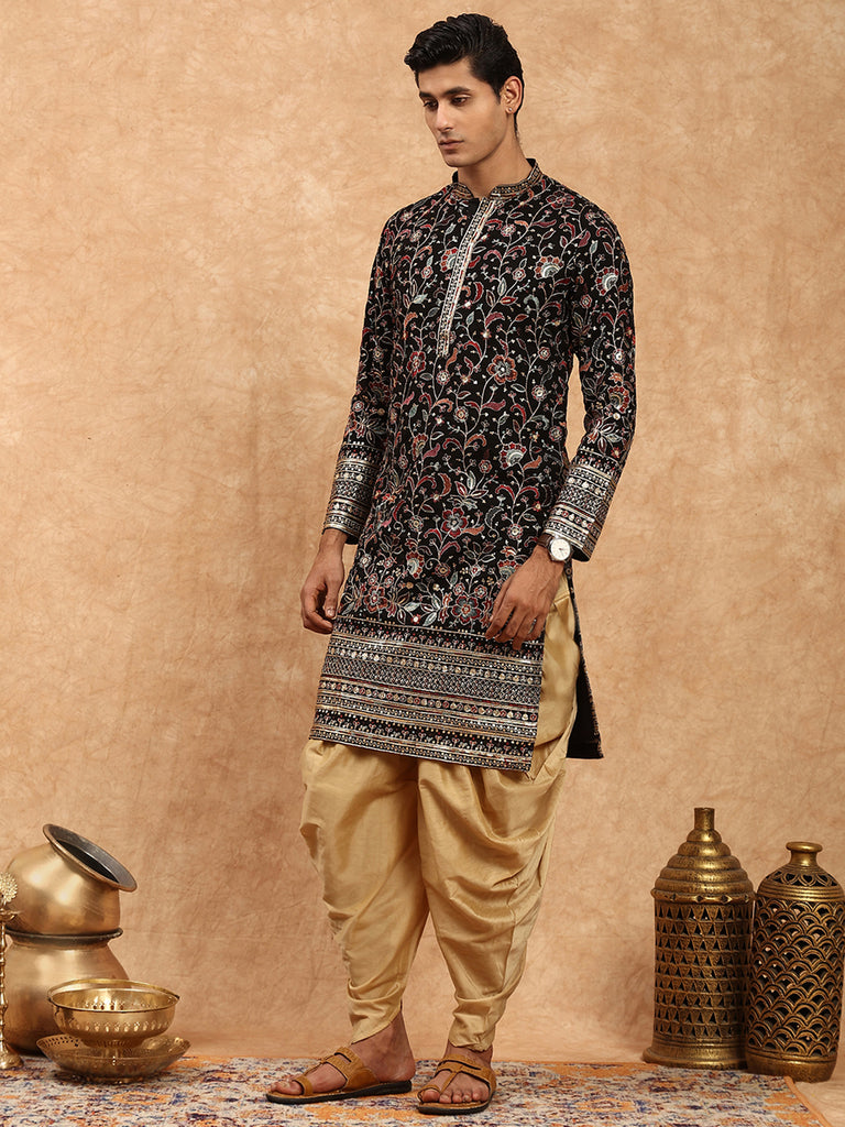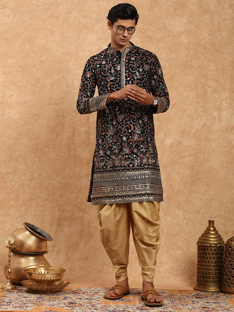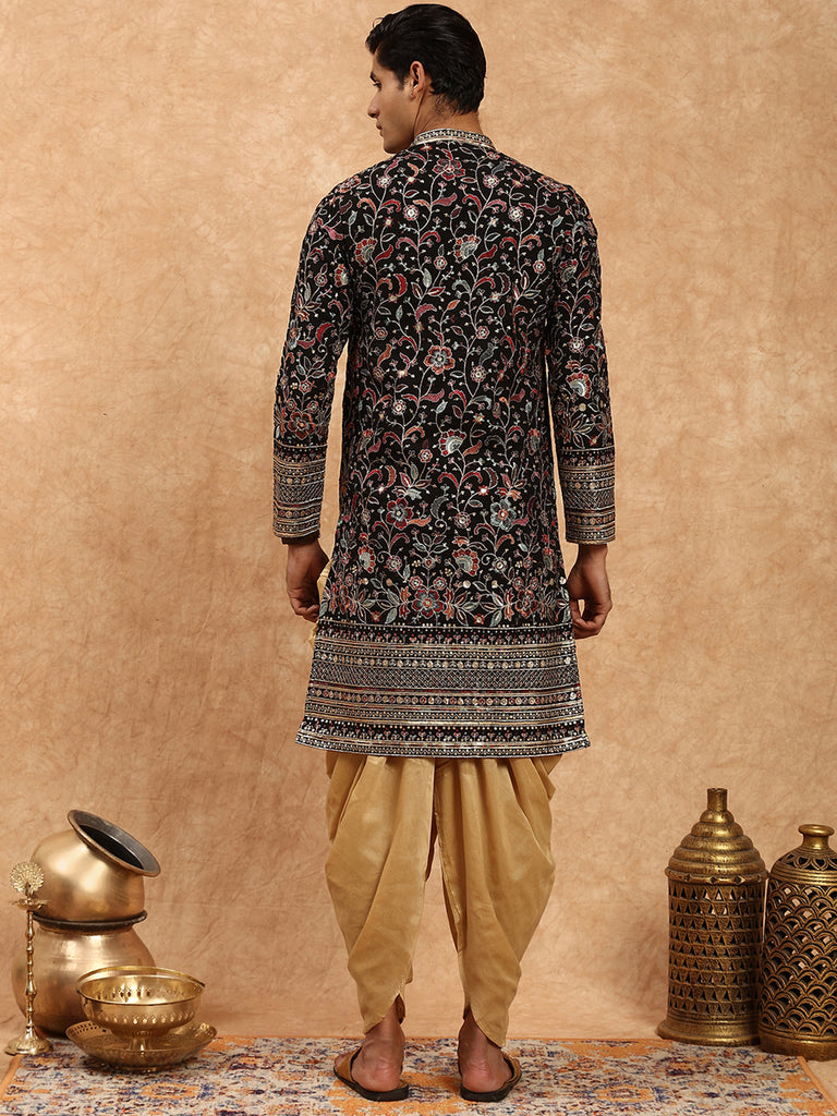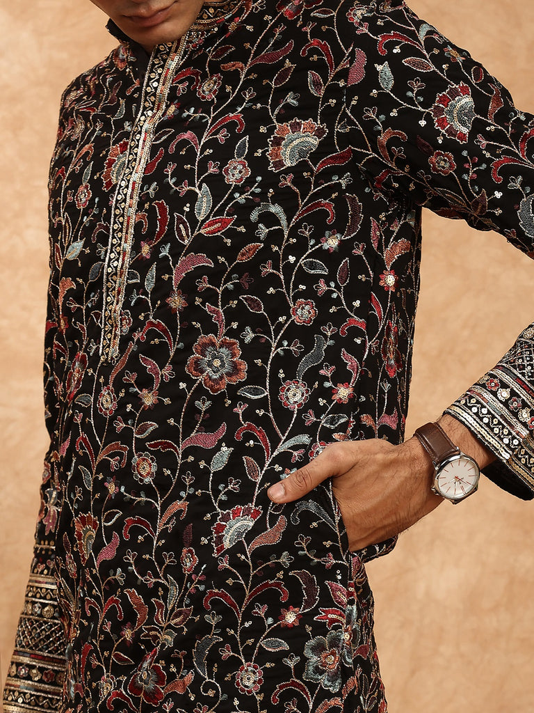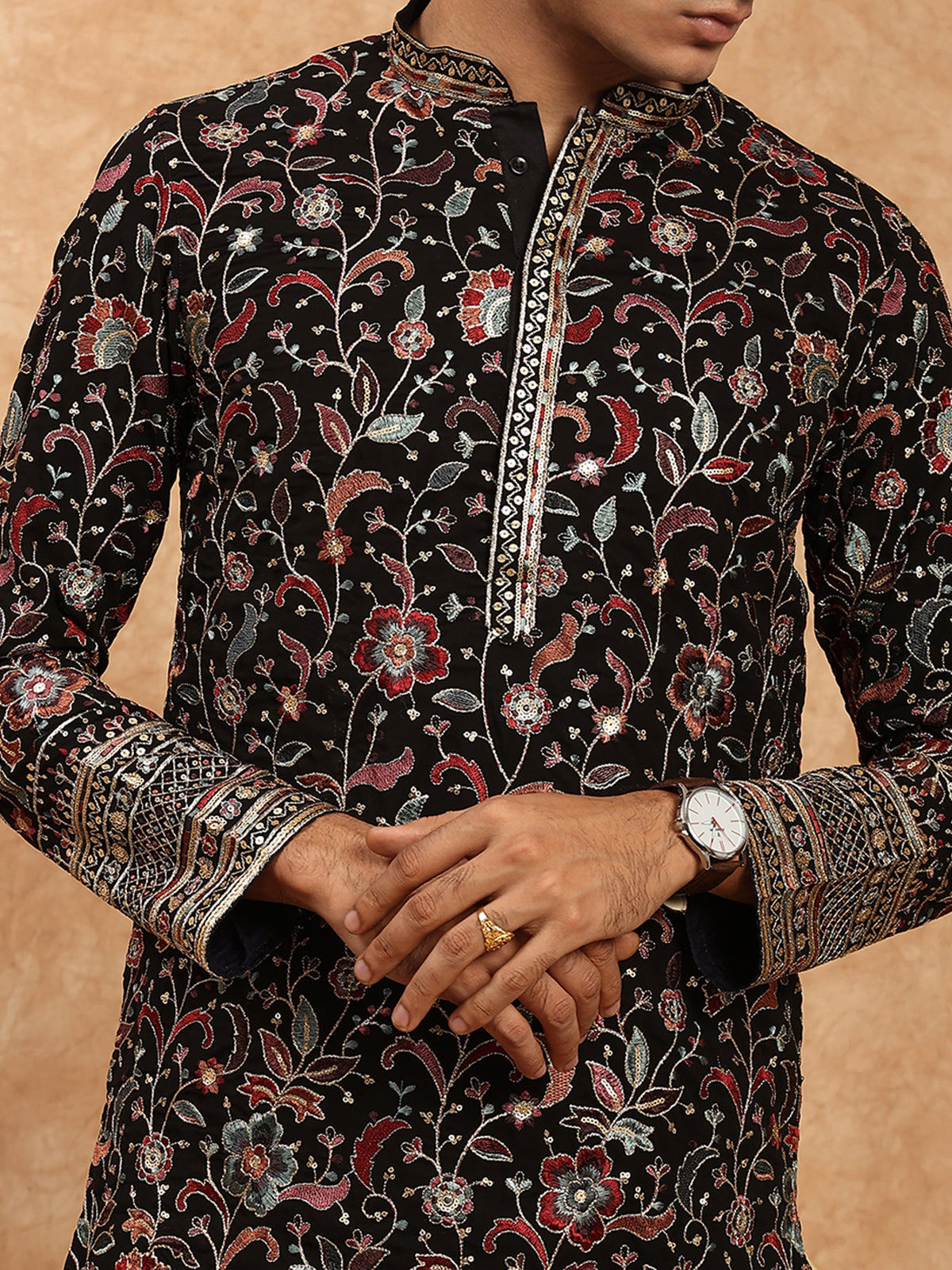 Sanwara Men's Georgette Black Sequins Work Heritage Embroidered Vintage Kurta Sets