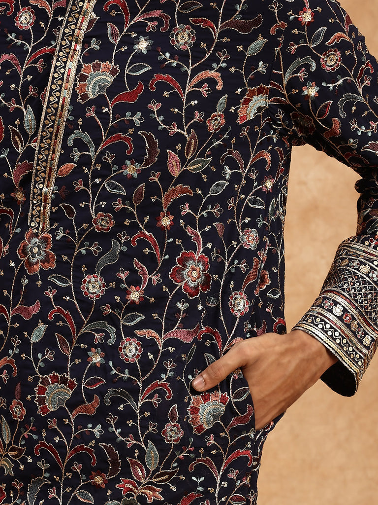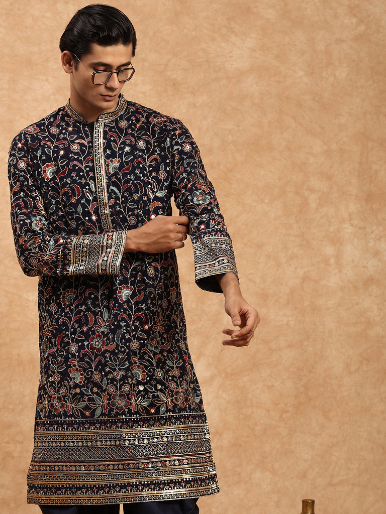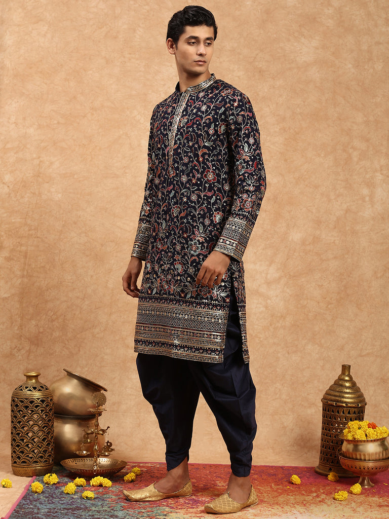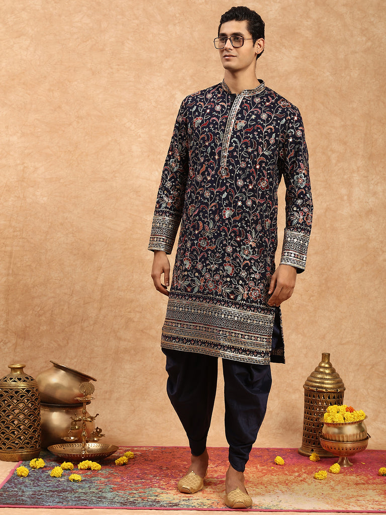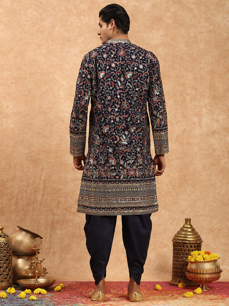 Sanwara Men's Classic Georgette Deep Blue Printed With Sequins Work Kurta Set for Every Occasion