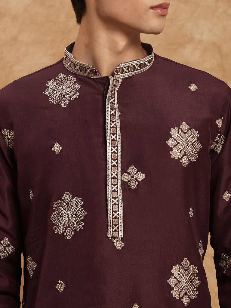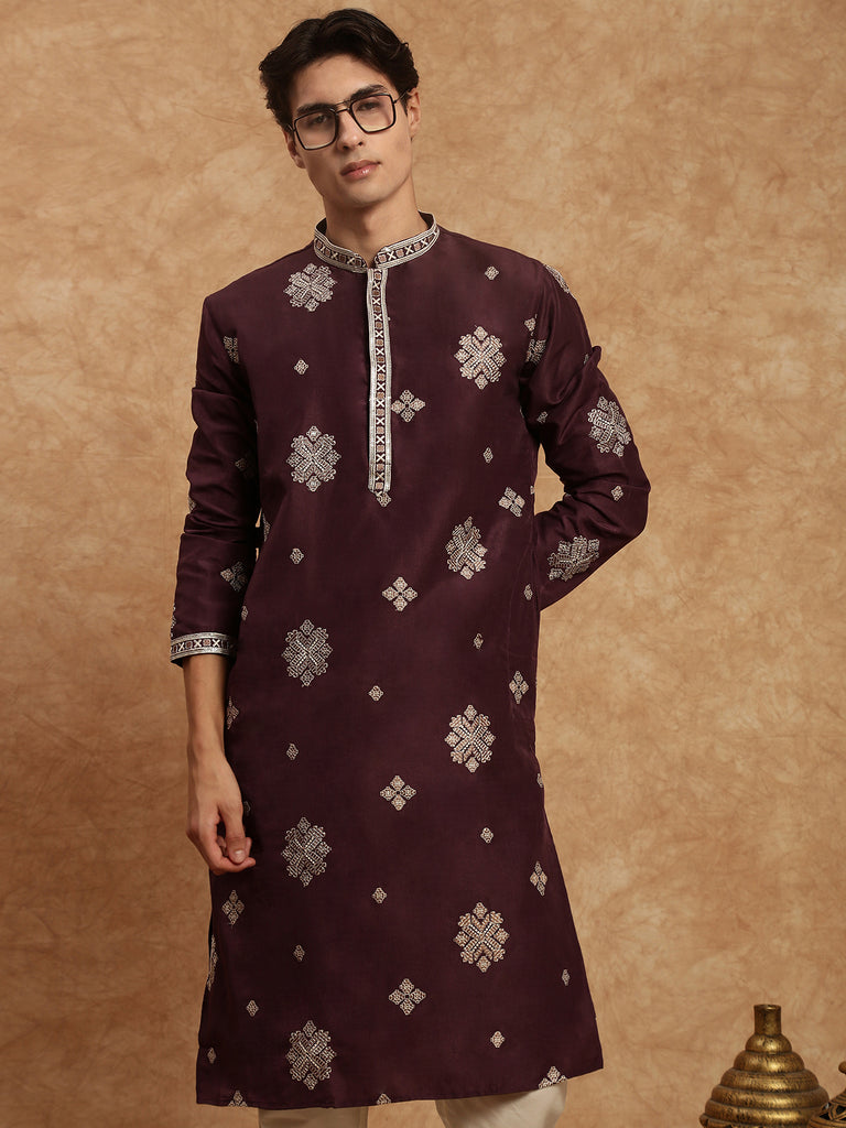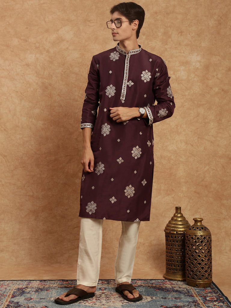 Men's Stylish Purple Trendy Embroidered Silk Kurta Set by Sanwara