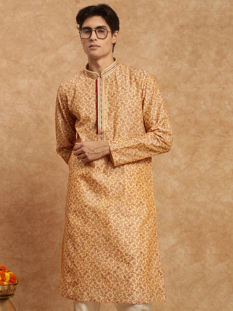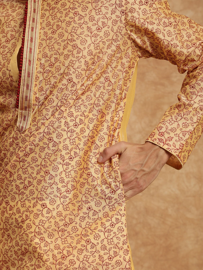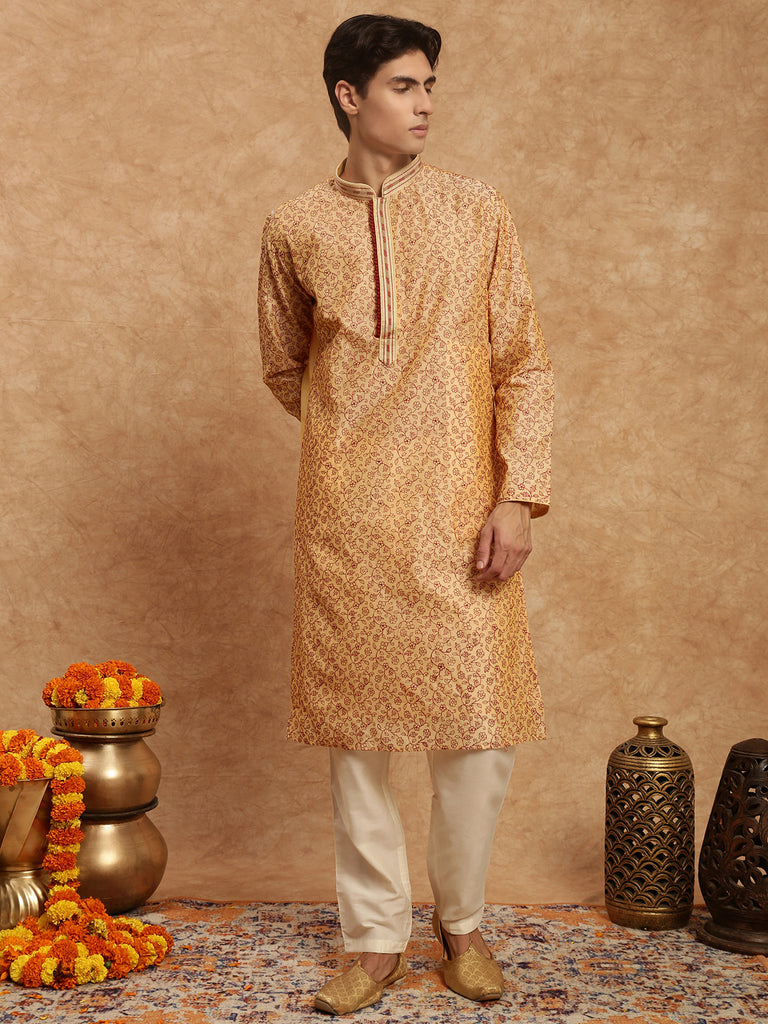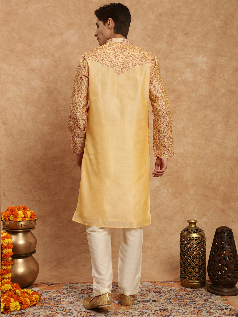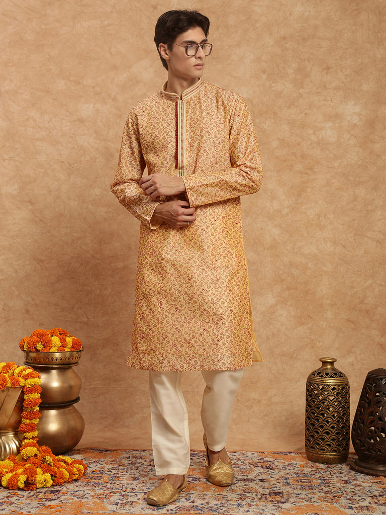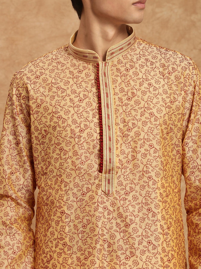 Men's Heritage Embroidered Work Beige Kurta Set In Silk by Sanwara
