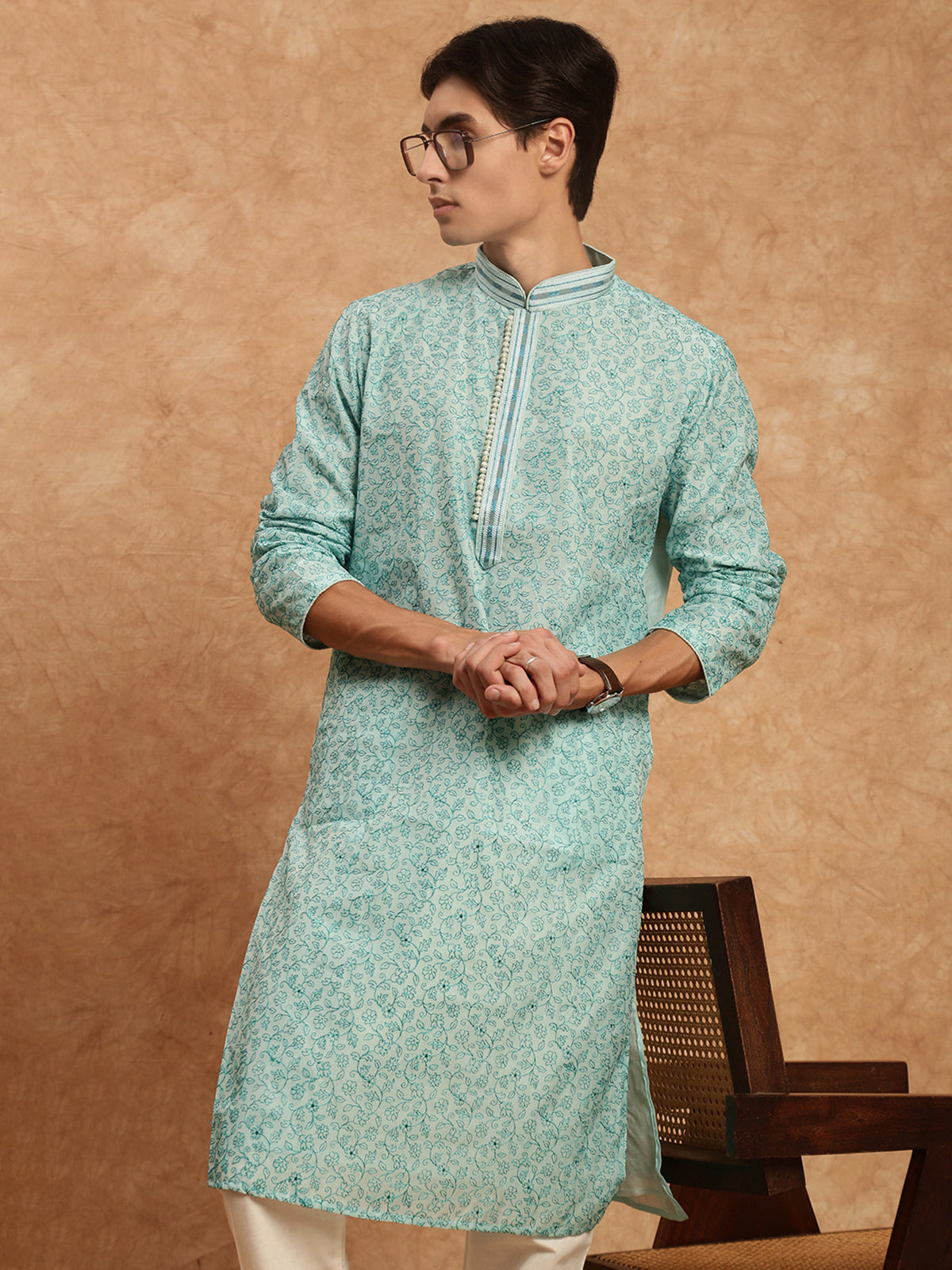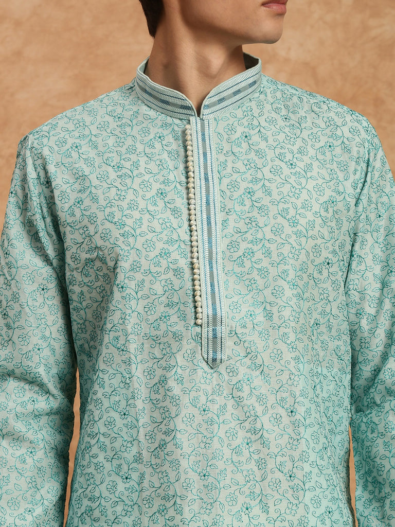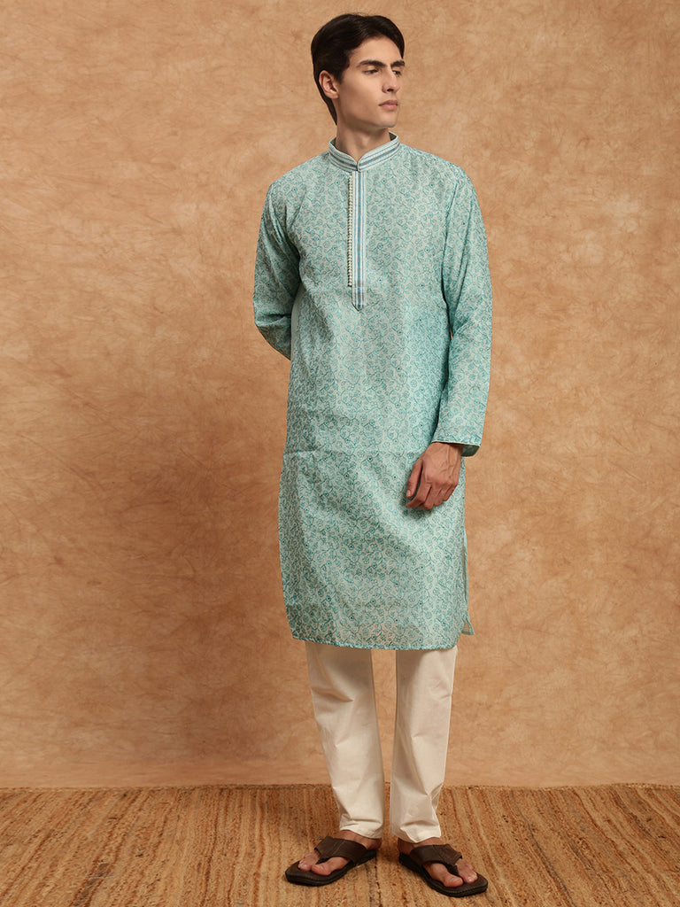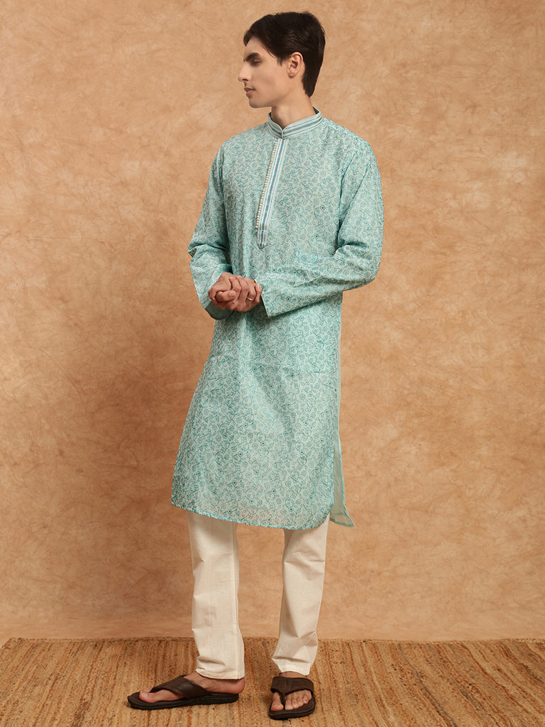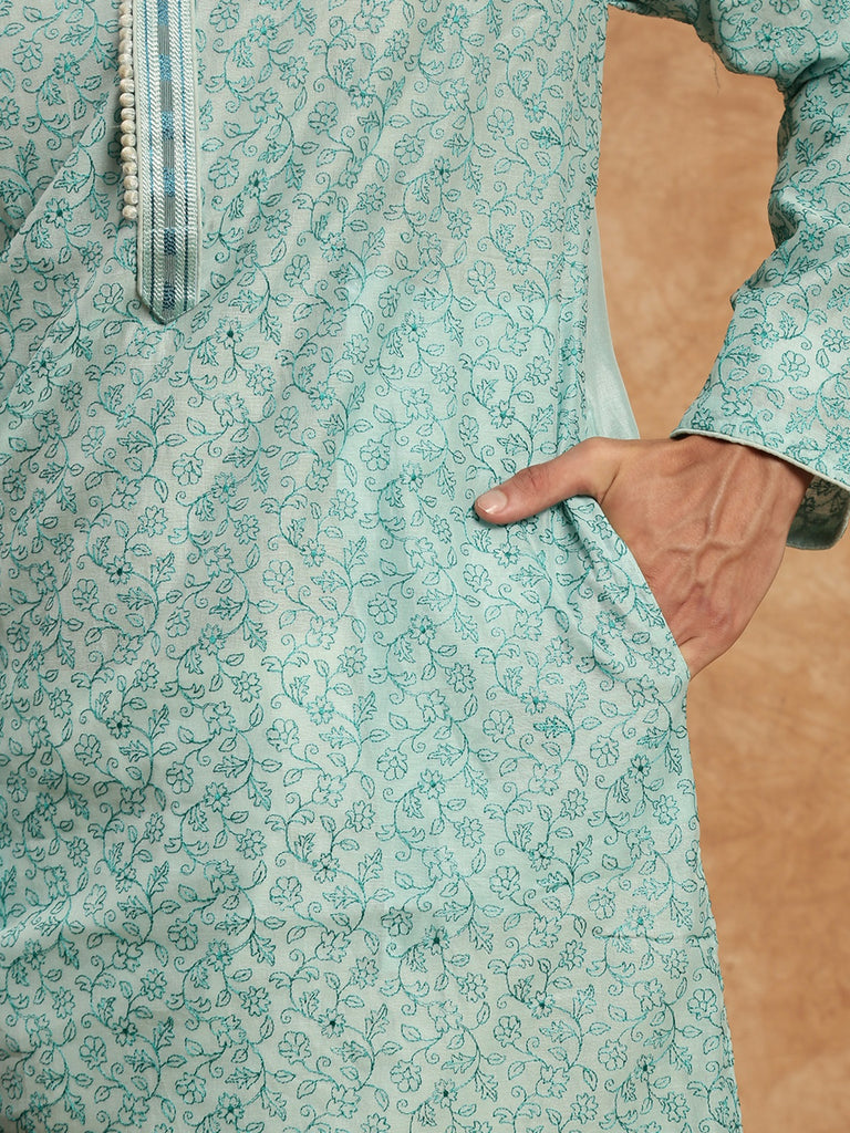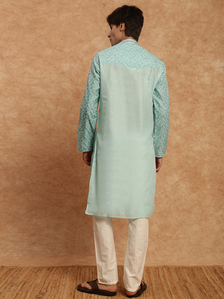 Men's Heritage Embroidered Work Sky Blue Kurta Set In Silk by Sanwara