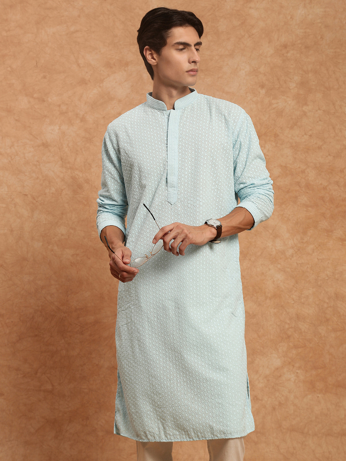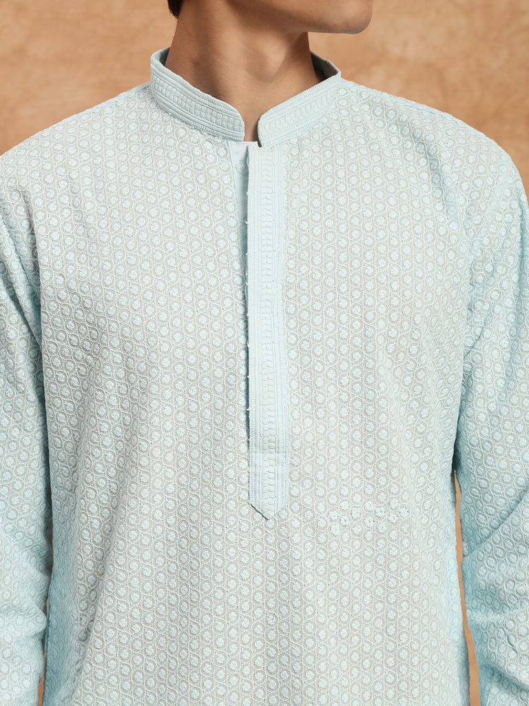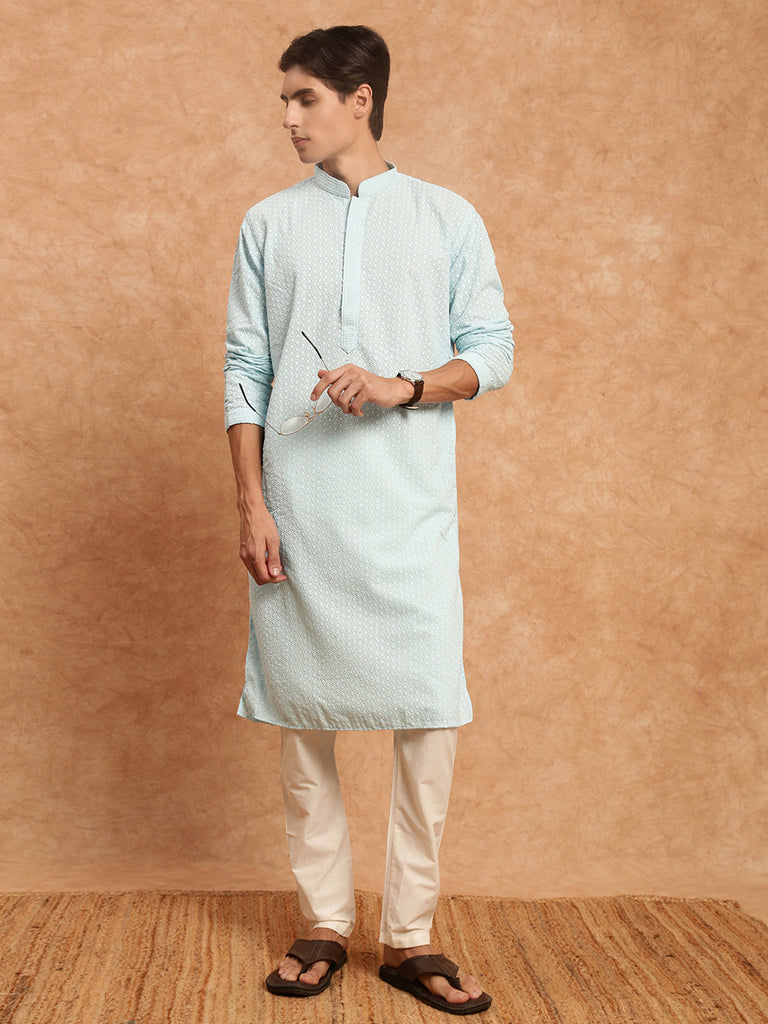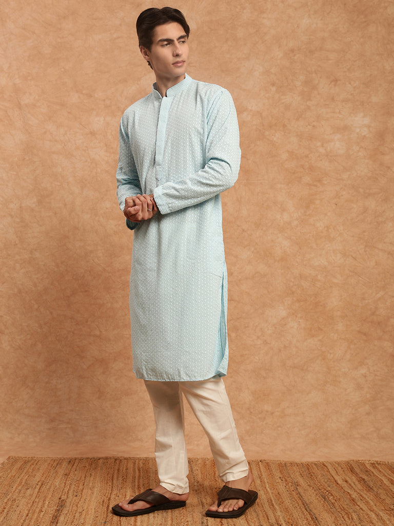 Sanwara's Solid Sky Blue Ethnic Chikankari Cotton Kurta Set for Men