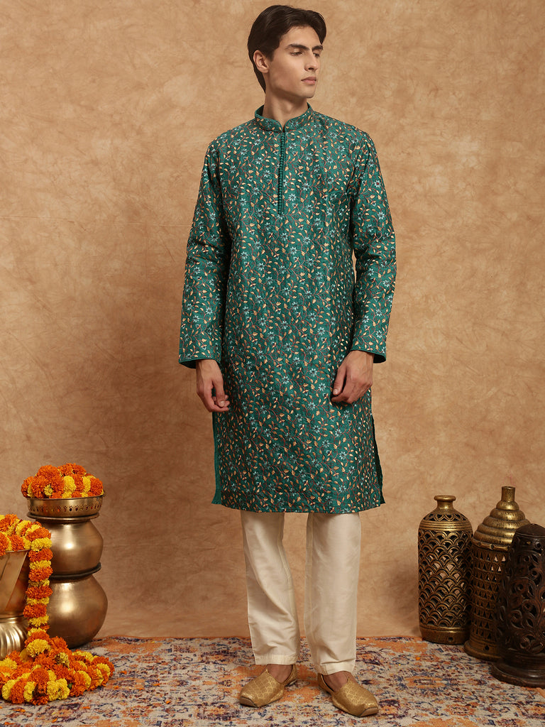 Men's Heritage Printed Work Embroidered Green Kurta Set In Silk by Sanwara