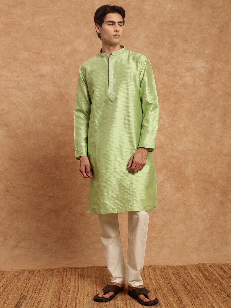 Sanwara's Solid Light Green Ethnic Woven Designer Silk Kurta Set for Men