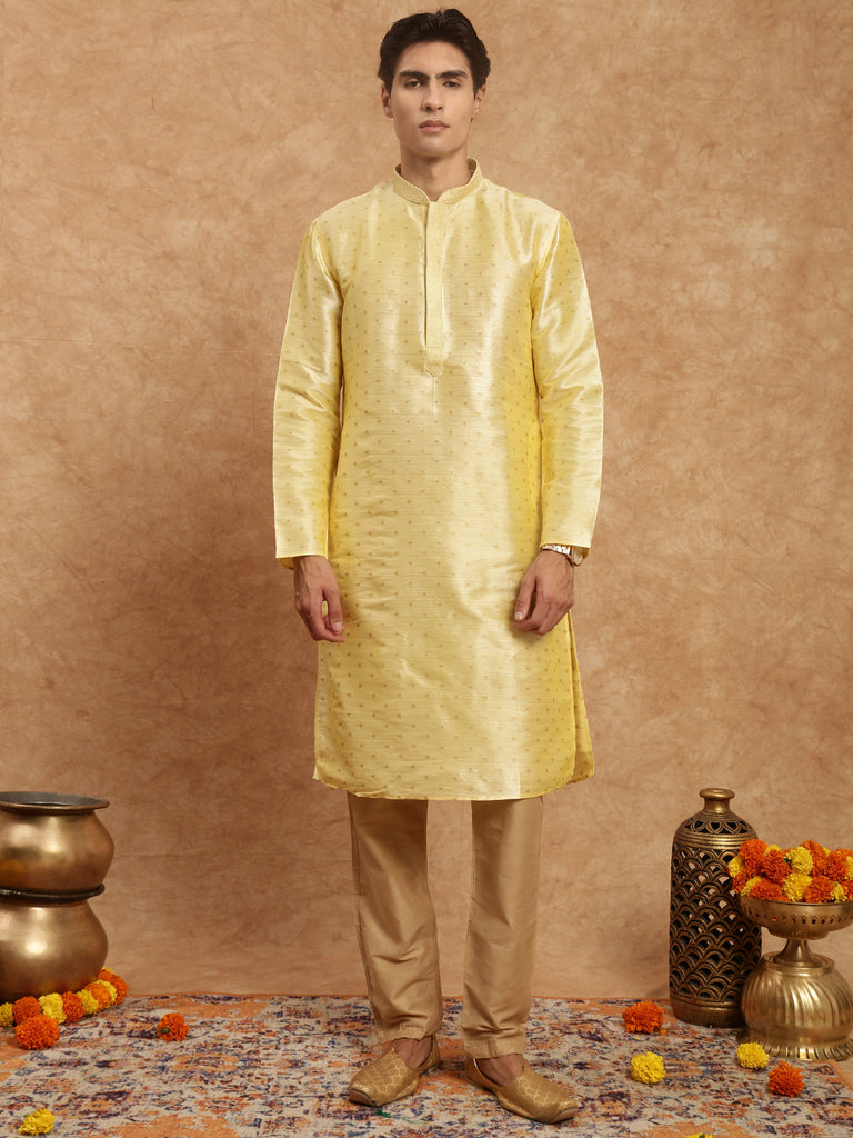 Sanwara's Woven Polka Dot Beige Ethnic Designer Silk Kurta Set for Men