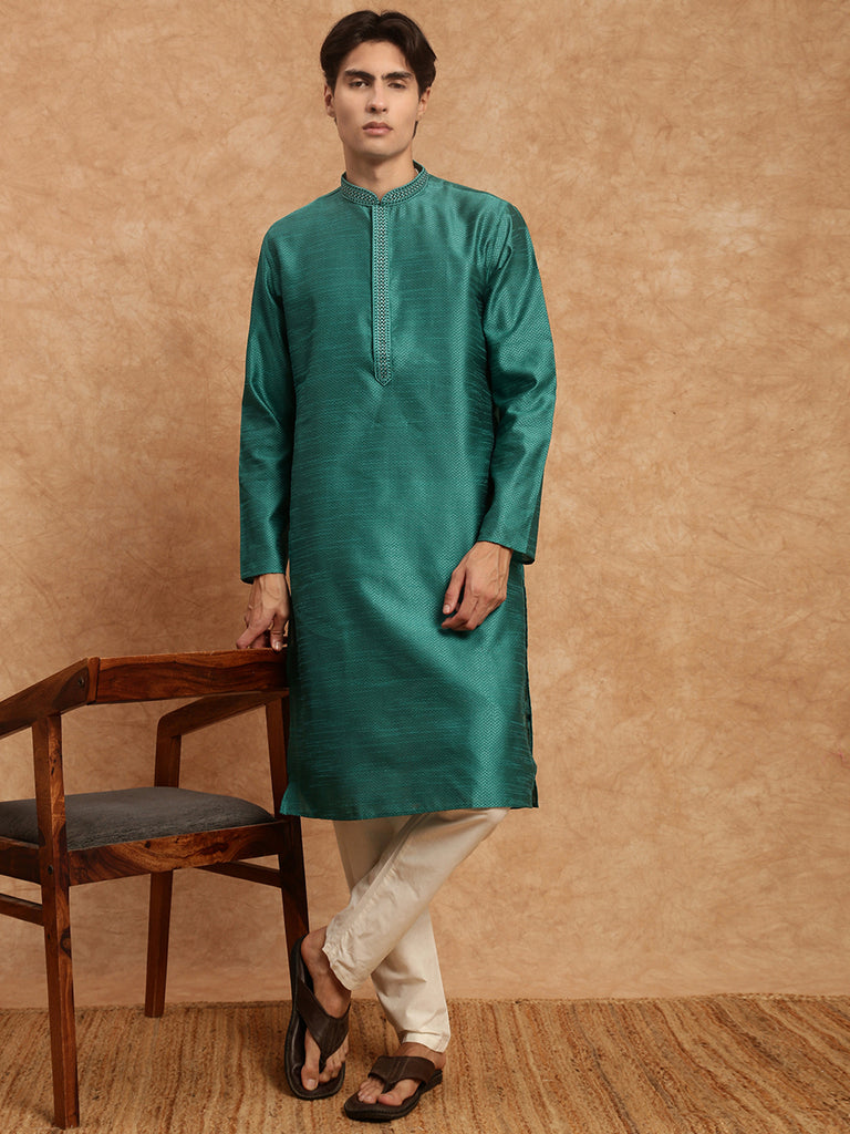 Men's Stylish Green Solid Traditional Silk Kurta Set by Sanwara