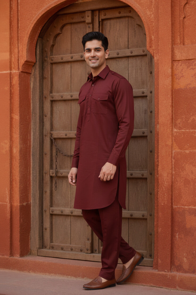 Sanwara Men’s Premium Solid Marron Pathani Kurta Set with Heritage Crafted for Modern Style