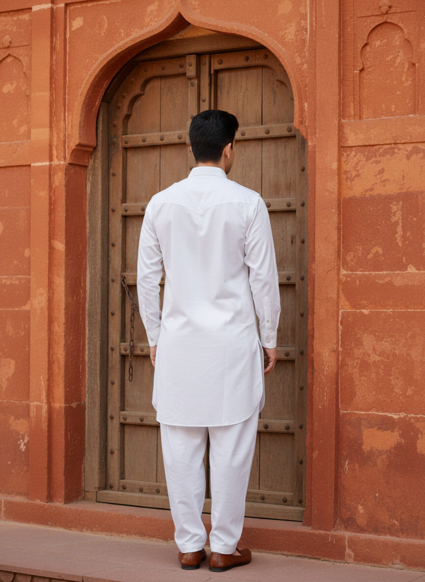 Sanwara Designer White Cotton Pathani Kurta Set for Men with Refined Contemporary Charm