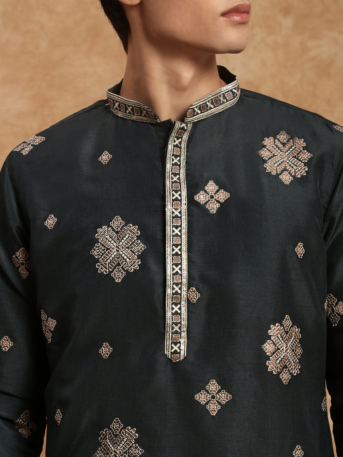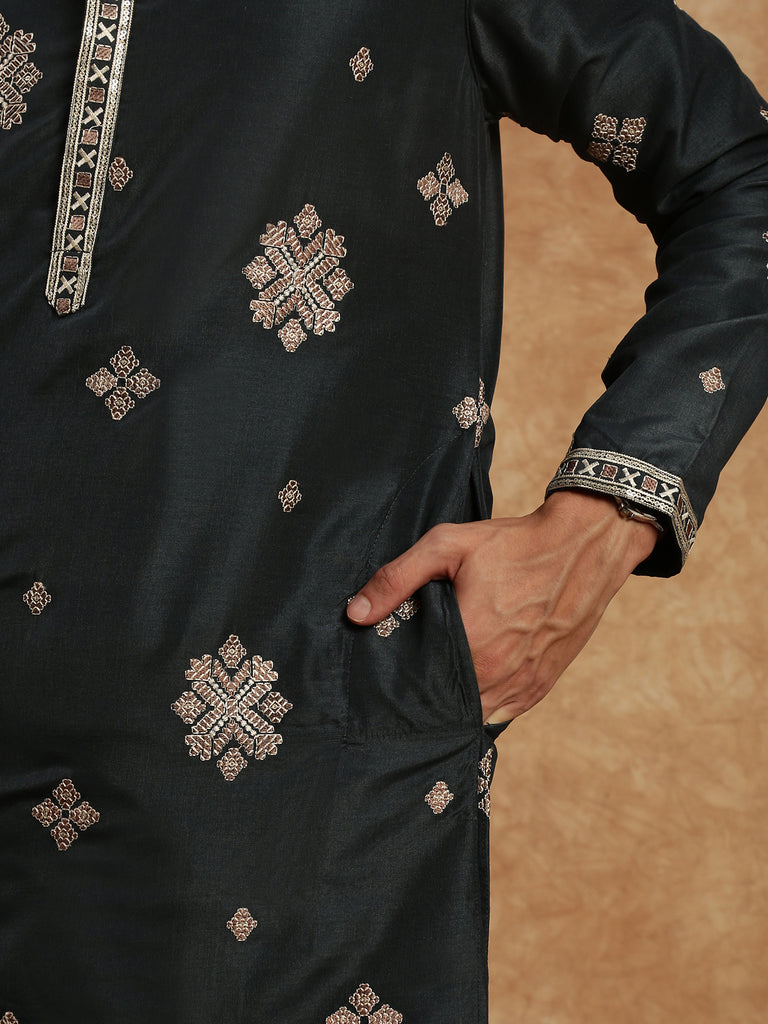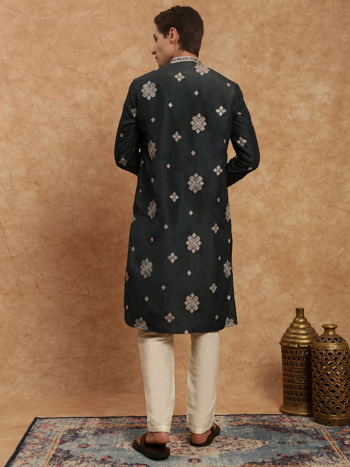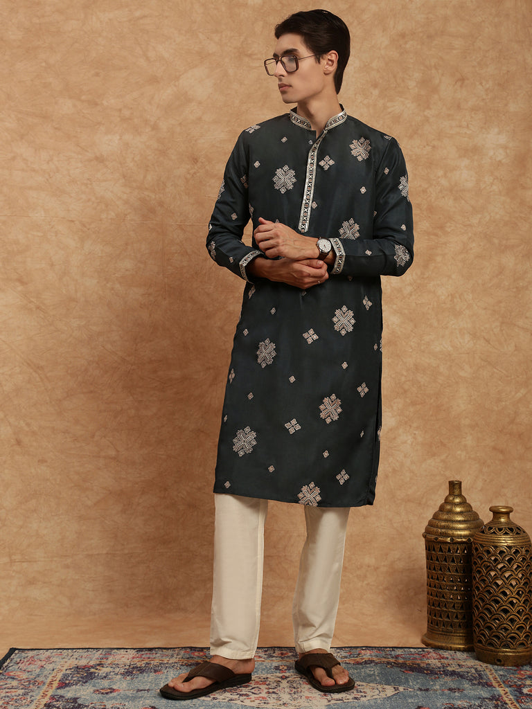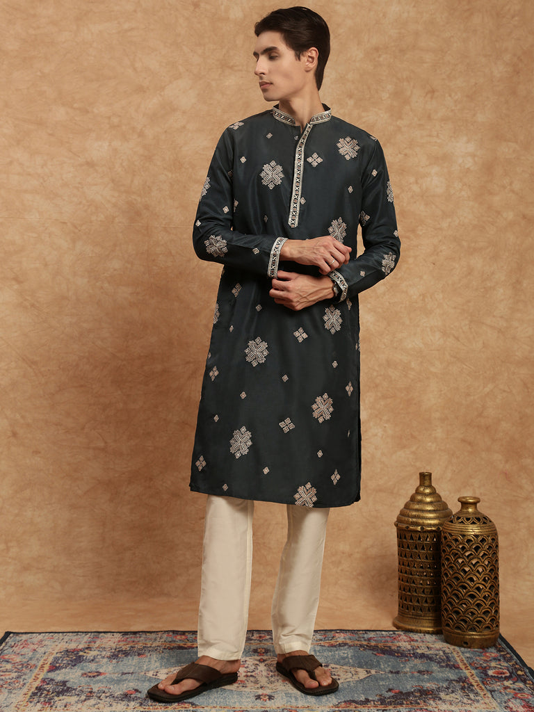 Men's Stylish Grey Trendy Embroidered Silk Kurta Set by Sanwara